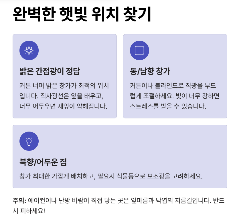 - 북향/어두운 집: 창가 최대한 가깝게 + 식물등(보조광) 고려
