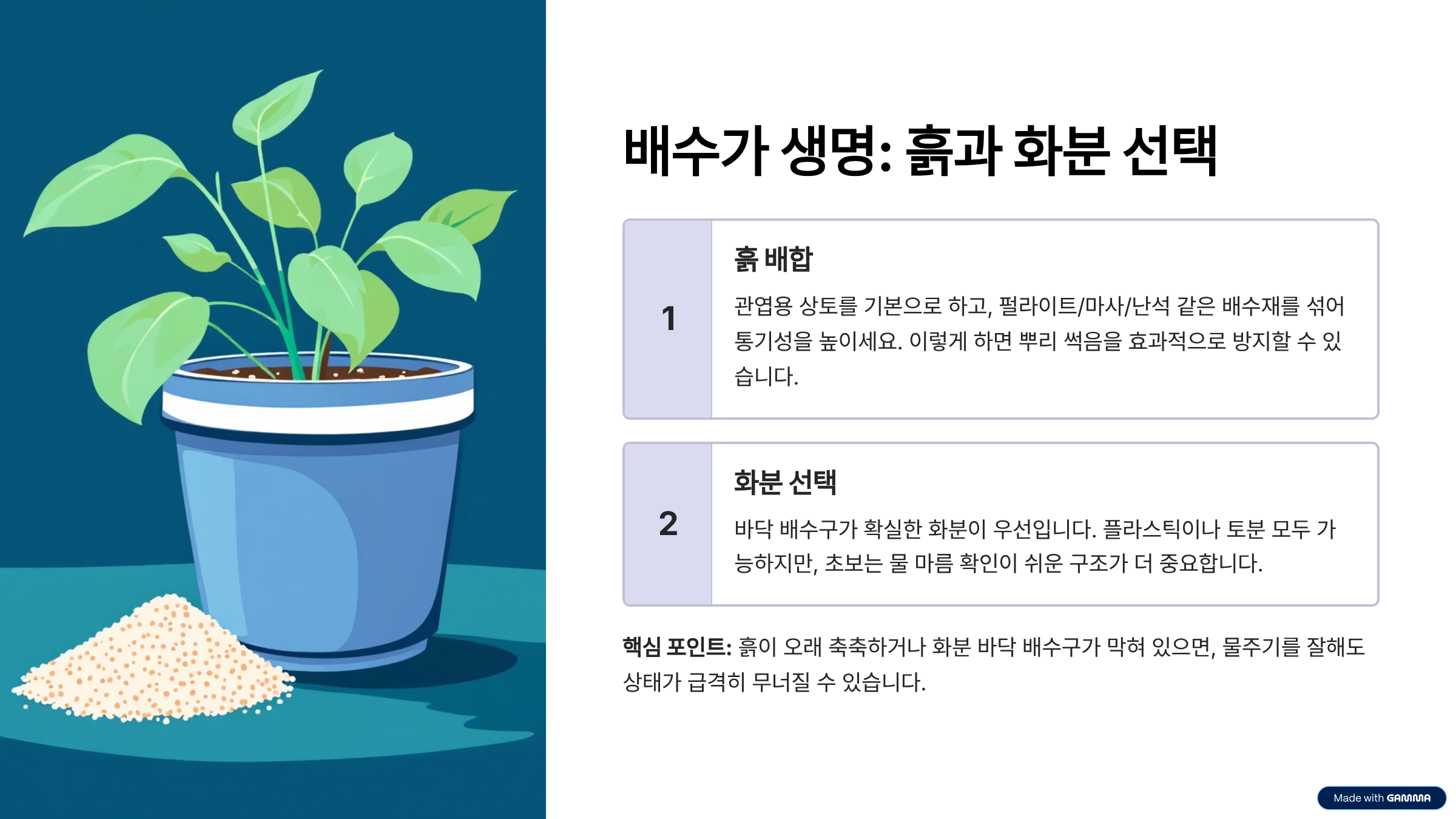 4) 분갈이·흙·화분: 뿌리 썩음만 막아도 반은 성공입니다